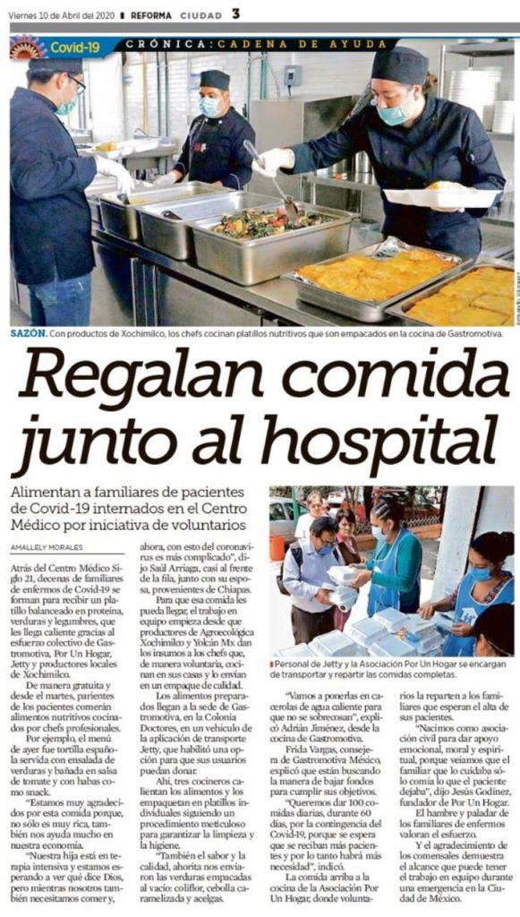 En un reportaje del periódico Reforma, narran como “los alimentos preparados llegan a la sede de Gastromotiva, en la Colonia Doctores, en un vehículo de la aplicación de transporte Jetty, que habilitó una opción para que sus usuarios puedan donar”.