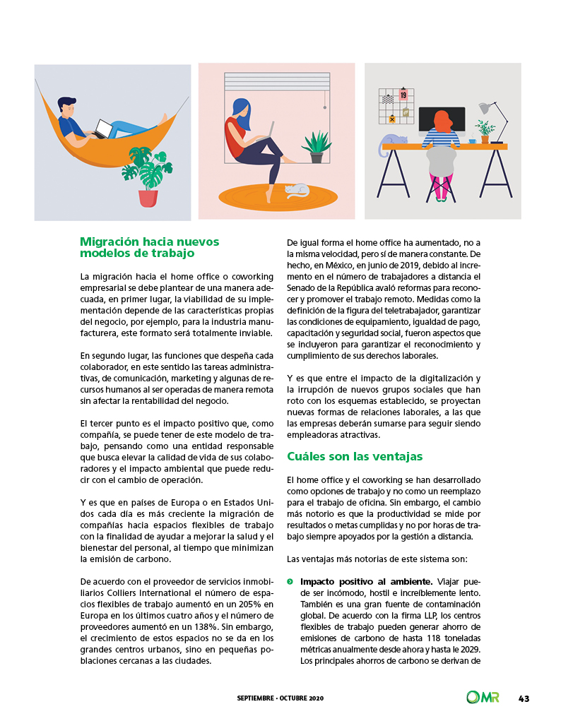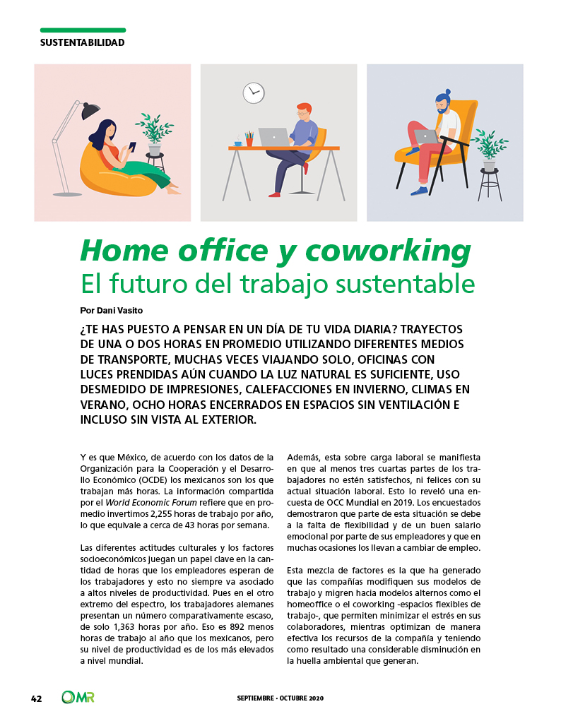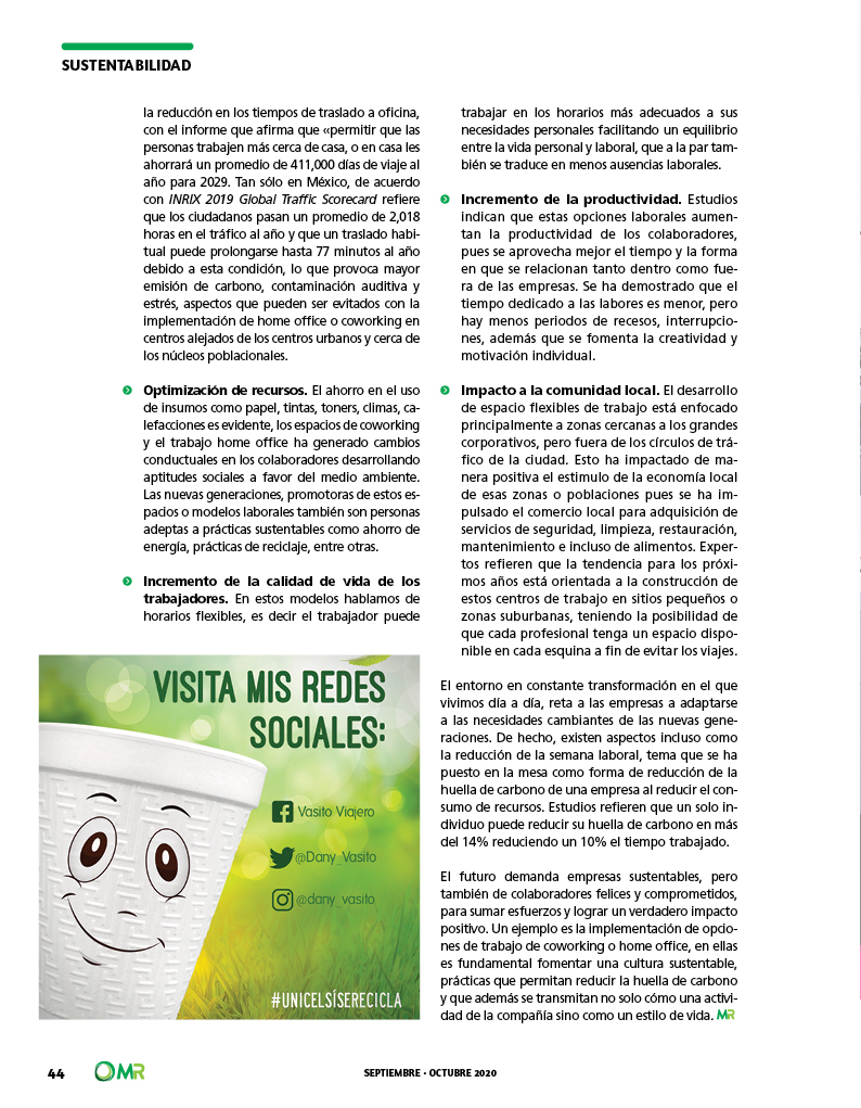 - Impacto positivo al ambiente Viajar puede ser incómodo, hostil e increíblemente lento. También es una gran fuente de contaminación global. De acuerdo con la firma LLP, los centros flexibles de trabajo pueden generar ahorro de emisiones de carbono de hasta 118 toneladas métricas anualmente desde ahora y hasta le 2029. Los principales ahorros de carbono se derivan de la reducción en los tiempos de traslado a oficina, con el informe que afirma que «permitir que las personas trabajen más cerca de casa, o en casa les ahorrará un promedio de 411,000 días de viaje al año para 2029. Tan sólo en México, de acuerdo con INRIX 2019 Global Traffic Scorecard refiere que los ciudadanos pasan un promedio de 2018 horas en el tráfico al año y que un traslado habitual puede prolongarse hasta 77 minutos al año debido a esta condición, lo que provoca mayor emisión de carbono, contaminación auditiva y estrés. Aspectos que pueden ser evitados con la implementación de home office o coworking en centros alejados de los centros urbanos y cerca de los núcleos poblacionales.